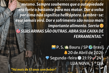 “O medo não é apenas o de cair, e se machucar muito. O medo maior é de sentir dó demais de si mesmo. Sempre soubemos que a autopiedade era forte o bastante para nos matar. Dar a volta por cima não significa helicóptero. Lembre-se: esse jamais virá. Dor e sofrimento são nosso mais importante alimento. Sorria 😊”
