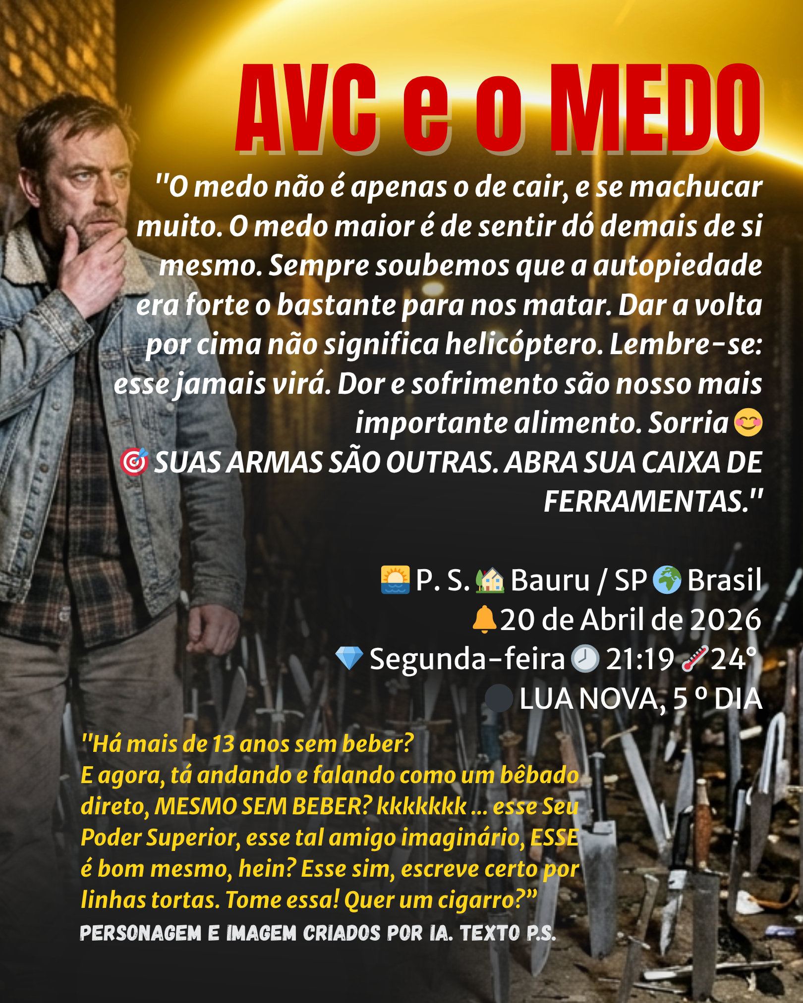 “Há mais de 13 anos sem beber? E agora, tá andando e falando como um bêbado direto? kkkkkkk … esse Seu Poder Superior, esse tal amigo imaginário, ESSE é bom mesmo, hein? Esse sim, escreve certo por linhas tortas. Tome essa! Quer um cigarro?” PERSONAGEM E IMAGEM CRIADOS POR IA. TEXTO P.S.