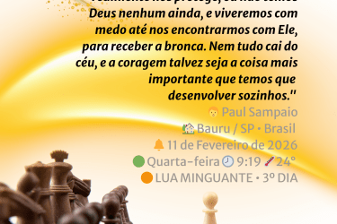“Depois de domar o ego e a vontade, pode sentar e tomar um copo d’água. Algumas coisas podem cansar. E lembre-se, sem a alma, seu corpo não vai para lugar nenhum, Paul. Cresça e se arrume, uma hora dessas eu passo pra te pegar. Ainda temos o gol pra marcar.” 🧑 Paul Sampaio 🏡 Bauru / SP • Brasil 🔔 22 de Janeiro de 2026